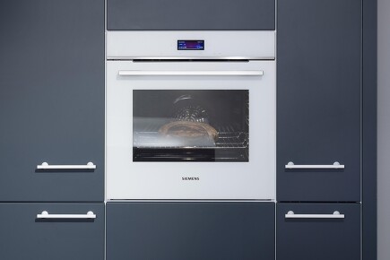 Helle Gerätefronten stechen inmitten dunkler Küchenfronten ganz besonders hervor. Weiß sorgt hier für den stärksten Kontrast. Es setzt ein stilvolles Highlight, lockert die Gestaltung auf und gibt Hochschränken ein elegantes Aussehen. Durch den bewussten Farbbruch – und weil Einbauöfen in Weiß eher die Ausnahme als die Regel sind – wird das Gerät zum Designstatement, ohne dabei aber an Funktionalität einzubüßen.