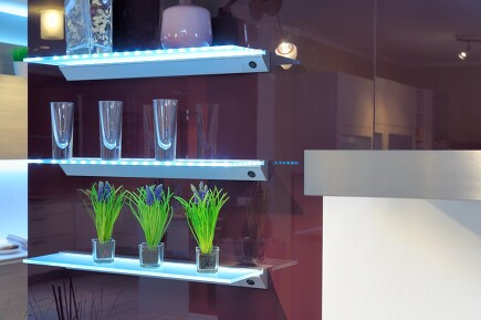 Eine schöne indirekte Beleuchtung entsteht in Küchenschränken mit Glastüren, die Sie durch den Einsatz von LED-Stripes illuminieren können. Diese schmalen Lichtbänder verbrauchen wenig Strom. Noch günstiger in der Anschaffung sind LED-Lichtschläuche, gut für den Bereich der Sockelleisten geeignet. Wenn Sie der Frühaufsteher sind, der sich oft morgens im Dunkeln seinen Kaffee macht, braucht es auch ein sanftes Licht für die Nische mit der Kaffeemaschine.