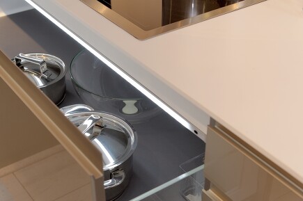 Eine Küche, die allen Anforderungen gerecht wird, benötigt auch Licht in allen Schattierungen: Zielgerichtete Spots auf die Arbeitsfläche, Innenschrankbeleuchtung für schnelles Finden, gekonnte Strahler, um architektonische Finessen zur Geltung zu bringen, Stimmungslicht für traute Abendstunden.