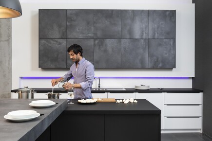 Der Trend zum Schwarz hält an und sorgt dafür, dass auch die Gerätehersteller möglichst viel schwarz gestalten, das früher noch silbern hervorblitzte: Ehemalige Edelstahlelemente werden entweder durch schwarze ersetzt oder weggelassen und kommen mit griffloser Gestaltung aus, bei der sich Gerätetüren durch Antippen oder auf Zuruf öffnen. Letzteres hilft, Fingerabdrücke zu vermeiden, denn gerade wenn die Ausführung in Schwarzglas erfolgt, werden sie störend sichtbar.