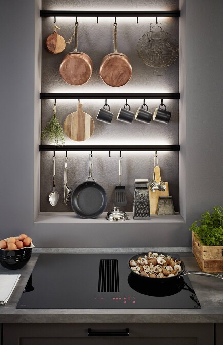 Auch bei den Reling-Systemen hat sich einiges getan, nicht nur in Bezug auf die Elemente zum Anhängen, Stellen oder Verstauen verschiedenster Küchenutensilien. Inzwischen kommen viele Wandstecksysteme mit indirekter LED-Beleuchtung, welche rück- oder unterseitig integriert ist.